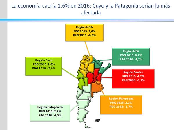 Lo que hay que decir es que las economías regionales no escapan a lo que pasa en general en la Argentina con el nivel de actividad, donde el PBI caerá 1,6%. Las regiones donde va a caer más el Producto Bruto Geográfico (PBG) son Cuyo, con una baja del 2,6% -la mayor caída por la industria, agricultura y comercio-, y en la Región Patagónica, con una baja del PGB del 2,5%, por la baja en la construcción, el comercio y la industria. La región que menos caerá es la zona del NOA, con una baja del 0,6% y presenta la menor caída que el resto por el mejor desempeño del campo.